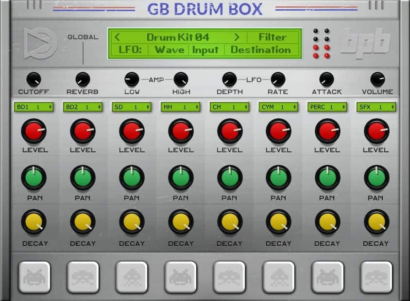 The user can adjust the volume, pan, and decay time for each Game Boy drum channel. The filter cutoff, reverb level, attack time, and modulation are applied globally.