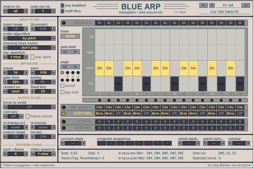 The developer describes BlueArp as a “pattern arpeggiator”, “step sequencer style arpeggiator” and an “arpeggiator with pattern input”. The bottom line is that this plugin can offer much more than a standard arpeggiator, borrowing some of its functionality from popular hardware groovebox instruments such as the Korg Electribe and Novation Nova’s arpeggiator.