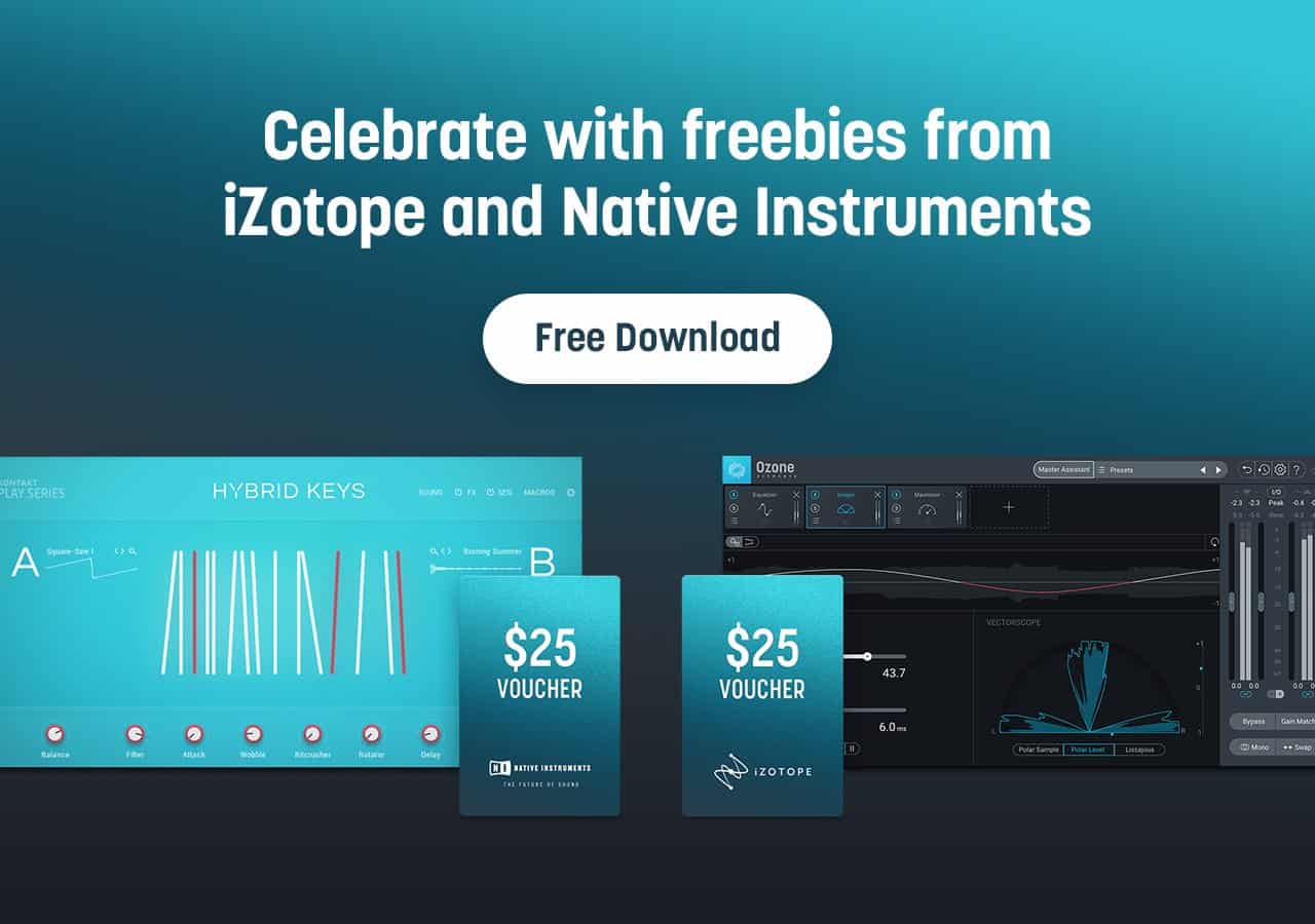 “Native Instruments has joined forces with iZotope—and to make it official, we’re teaming up to bring everyone iZotope Ozone Elements and Native Instruments HYBRID KEYS for free! Celebrate with us by grabbing your free copy of each below, plus get a $25 voucher for both online shops.”