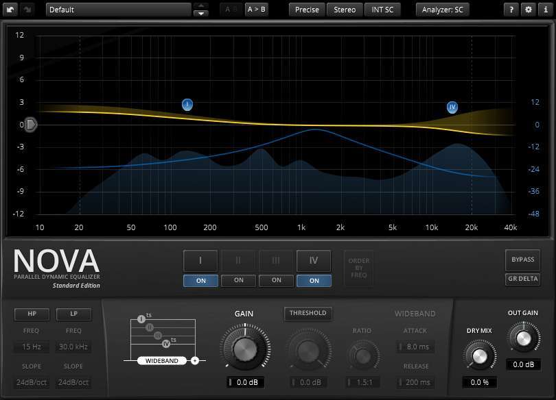 The brand new TDR Nova equalizer brings an improved set of features, packed in a much more refined user interface (although we were quite fond of the no-frills scientific look of the original Nova-67P plugin). TDR Nova sports a classic parametric equalizer layout, expanded with an elaborate dynamics section. The plugin is suitable for extremely precise and versatile dynamic processing of the audio material on the input, be it a full stereo mix or a single audio track. It can work well as your standard bread and butter parametric EQ, as well as a powerful dynamics processor with frequency selective compression and multi-band compression for mastering purposes.