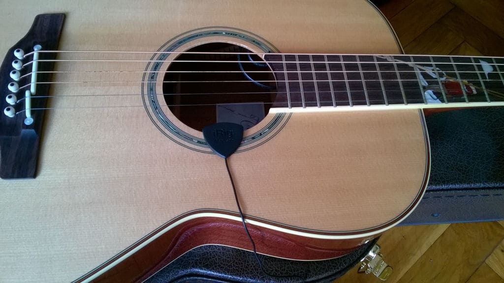 For live use where feedback would make that condenser useless, the iRig Acoustic Stage is a great solution – that’s why it has “Stage” in the name. The mic is more sensitive to feedback than the piezo, but, of course, a lot less sensitive than an external microphone pointed at the guitar would be. The feedback cancel button does help somewhat, but would not be enough for playing with a loud drummer while getting audible guitar signal in your monitors – no microphone will really work for that. The microphone is fairly sensitive to hitting the soundboard or the mic cover with a pick, certainly more so than the under-the-bridge piezo, but not extremely. Even drumming on the top with the fingers is musically usable, and not overwhelmingly loud. Adjusting the volume works quite well, and can be done by feel even with the preamp mounted on your back, but the on/off switch makes a loud pop when switched off, even with the volume set to zero. Although switching it on is nice and quiet, you have to remember to not turn the preamp off without turning the channel or amplifier it’s plugged into to zero first. Otherwise, the sound guy will hate you.