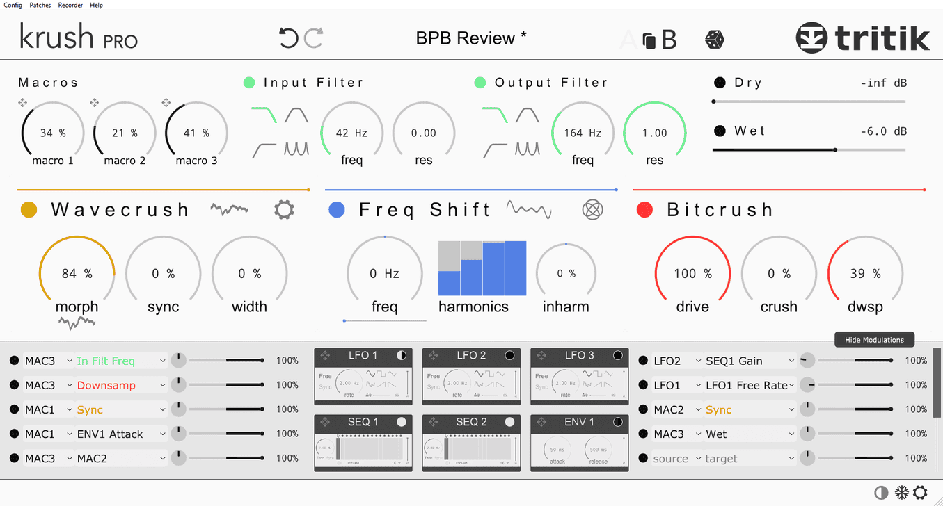 It seems that Tritik took every single Krush feature one step further (or even several steps further in some cases). We now get two multi-mode filters instead of one, three FX modules instead of one, and a significantly more advanced modulation architecture. Last but not least, KrushPro introduces stereo modulation capabilities and three macro modulation knobs that can control multiple parameters simultaneously. Merely looking at the new interface, one can’t help but notice that KrushPro looks like the original Krush plugin on steroids.