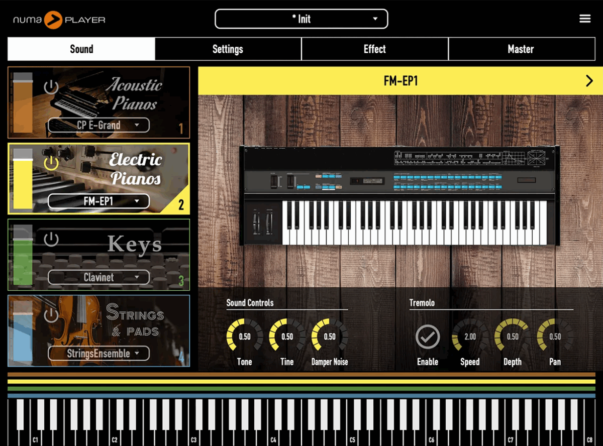 Numa Player comes with four sound categories, each containing multiple variations. The categories include Acoustic Pianos, Electric Pianos, Keys, and Strings & Pads.