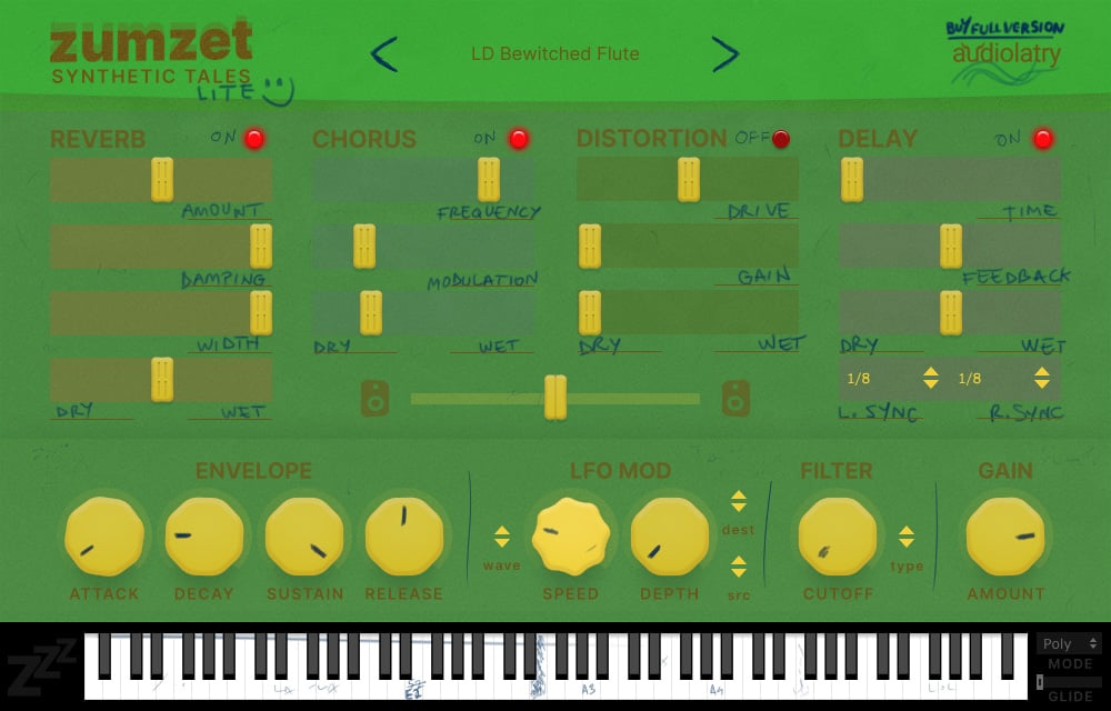 Zumzet Lite comes with 23 presets covering keys, leads, pads, and synths, with a small footprint of just over 200 MB. It has an ADSR envelope shaper, low/high pass filter, voice mode and glide, and many of the other basics that you would expect in an instrument like this, such as an LFO modulator.