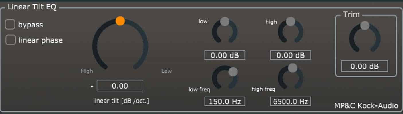 The interface is a modern looking affair. A large knob on the left-hand side controls the tilt (marked for high and low frequencies), whereas the two knobs on the right control the high and low EQ bands. Above them are two more controls for adjusting the gain of the high and low shelves, with up to ±3 dB for the tops, and ± 6dB for the bottom end (which could be very handy for drum tracks, or curbing those bass synth sounds). Next to these is a simple Trim knob for gain control. Placed at the very top, there are two tickboxes marked “bypass” and “linear phase” which allow you to switch between the linear and minimum phase setting for the EQ, or bypass the plugin altogether.