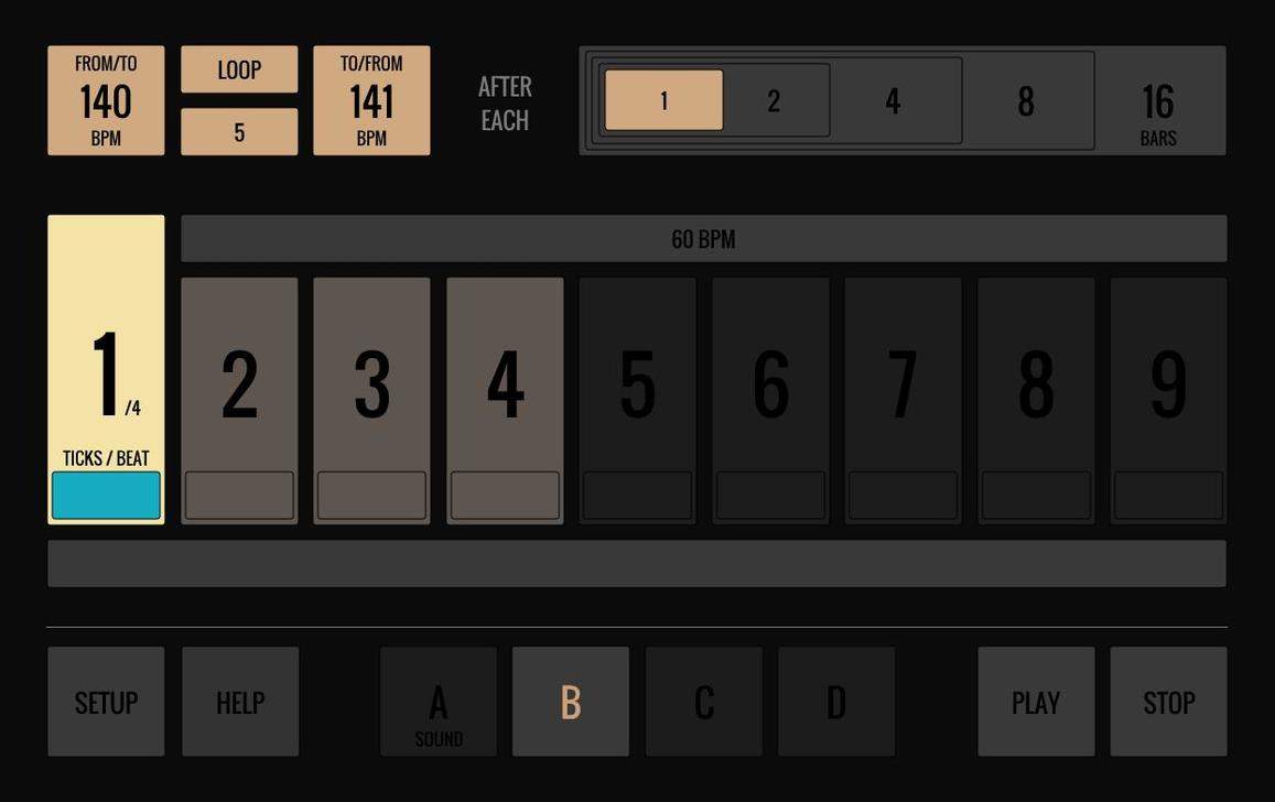 The functionality isn’t lacking, either. There are four modes to choose from – a basic fixed tempo mode and three modes in which the BPM changes over time. You can set Metronom to increase or decrease the tempo from one BPM value to another over several beats, or make it loop between two BPM values (the BPM can be set to change its value in steps or in continuous “float” mode). There are also four sound presets to choose from (it would be cool to also have the option to load external metronome sounds) and the app can actually be used to send MIDI OUT sync, which is a pretty neat feature if you want to sync some external hardware to your computer.