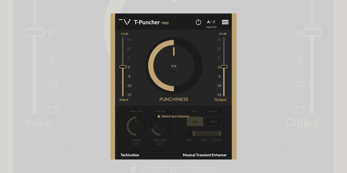 Techivaiton’s premium version of T-Puncher has additional features, including presets, attack and ‘smoothing’ controls, ‘soft’ or ‘hard’ settings, as well as a filter. Whilst these options give you more control, the free version is still a great free transient shaper.