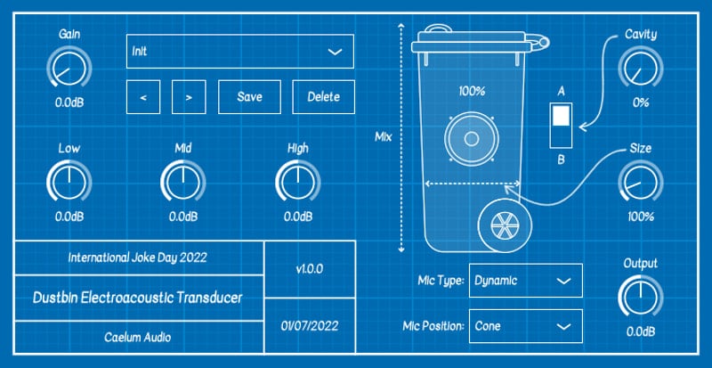 The interface is simple and designed like a blueprint. You have the outline of the bin, wheel and all, along with basic controls. It has a 3-band EQ along with controls for mic type, position, size of the bin, and placement within the cavity. Everything thing you need for putting some junk in your funk. Yes, the puns come with the territory.