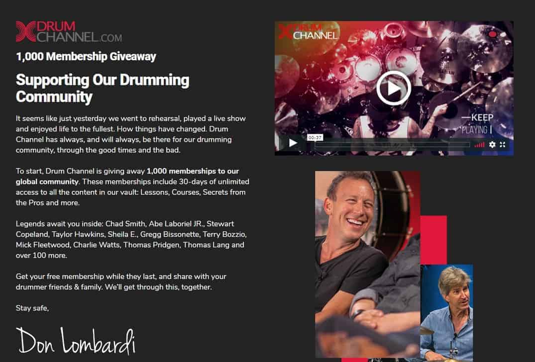 Drum Channel is giving away 1,000 free memberships which include 30-days of unlimited access to all the music courses on their website. The included content covered video lessons, in-depth drumming courses, interviews with pro drummers, and more.
