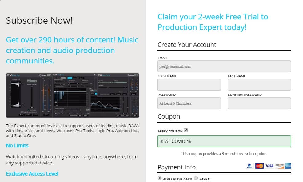 Production Expert is offering a free three-month subscription for new users after the standard 2-week free trial ends. Use the coupon code BEAT-COVID-19 at checkout to activate three months of free access. IMPORTANT: You will need to enter a valid payment method at signup.