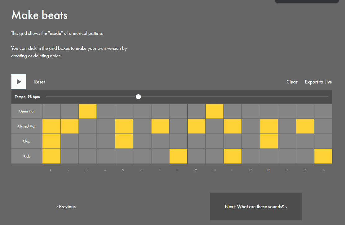 Ableton’s free music production and sound design courses are a great starting point for beginners. Both courses are highly interactive and surprisingly fun. The basic idea is to actually use virtual instruments and effects while you learn about music production. Throughout the course, you’ll learn about sequencing and composition while using virtual drum machines and softsynth in your browser.