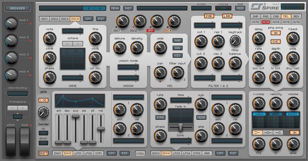 Not only does Spire offer a wealth of features, but it provides access to those features in a manageable and beautiful interface, somehow keeping hidden pages and tree menu navigation down to a minimum, resulting in a fluid, unencumbered workflow. This is what I like to see. The controls are laid out in a very organized manner. I don’t feel overwhelmed or intimidated. I have no trouble keeping track of what I’m doing or what I was doing five minutes ago. I can go right to work and have fun while I’m doing it!