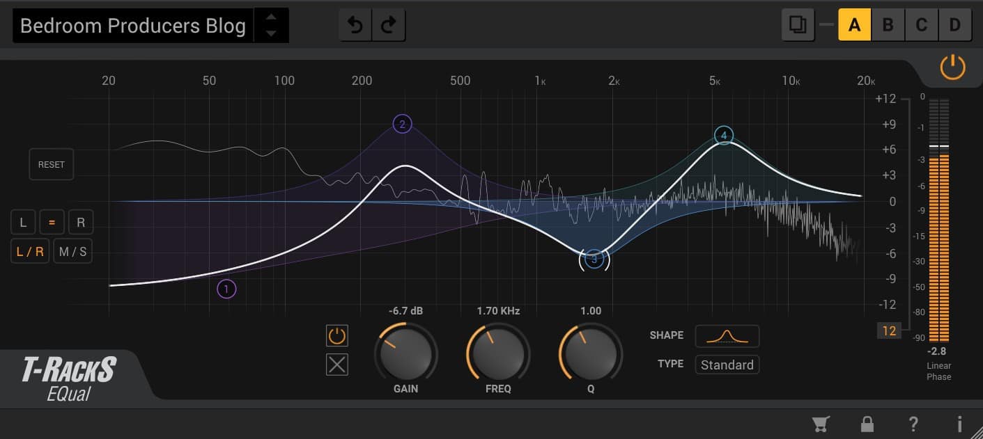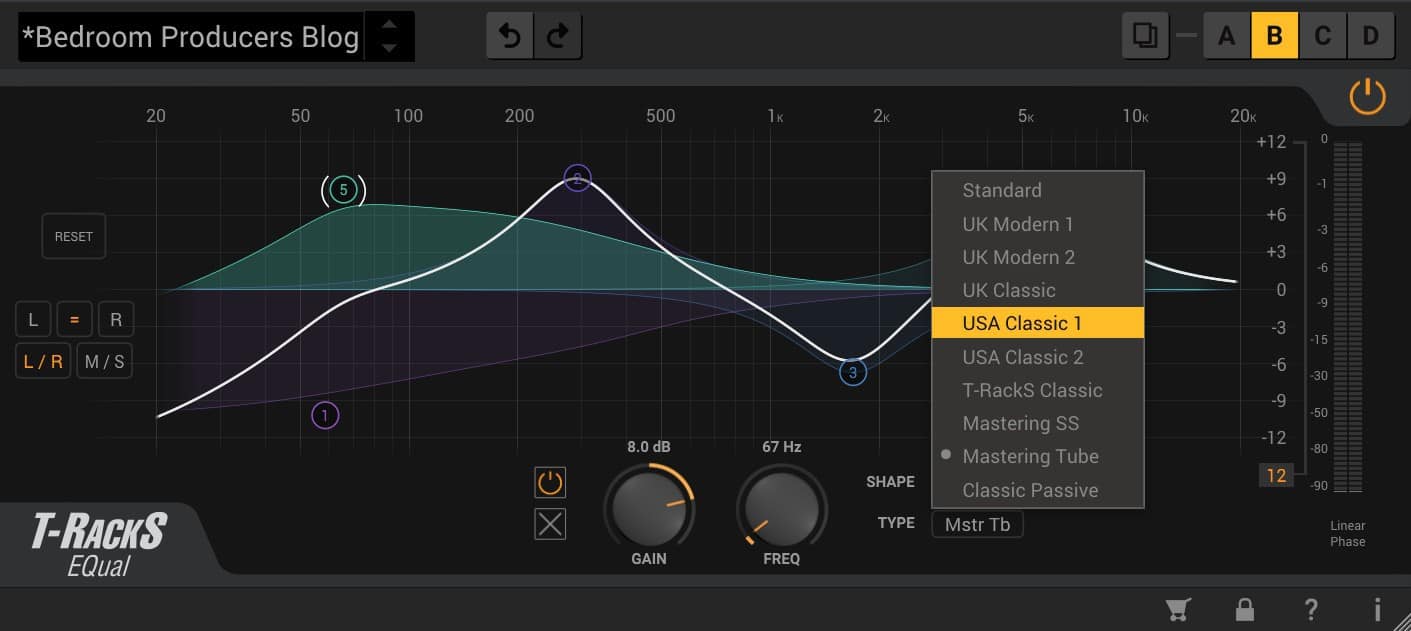 EQual can operate in L/R and M/S modes. The user can save custom presets or access a range of included presets for mixing and mastering. Unlimited undo-redo functionality is also included, along with A/B/C/D comparison.