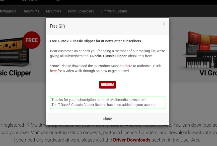 So, if you’re already receiving marketing emails from IK Multimedia, the free T-RackS Classic Clipper license is already waiting for you on the My Products page. If not, you should subscribe first and then visit the My Products page after logging in.