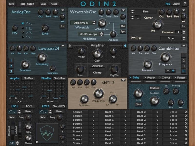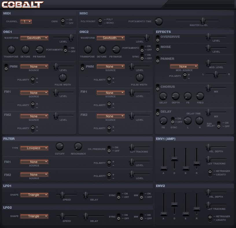 Synth1 emulates the Nord Lead 2 synthesizer. It features three main oscillators, one sub-oscillator, a multi-mode filter, two LFO modules, two envelopes, an arpeggiator, and several built-in effects. The instrument’s sonic character is purely digital and relatively tame compared to VA synthesizers trying to sound analog.