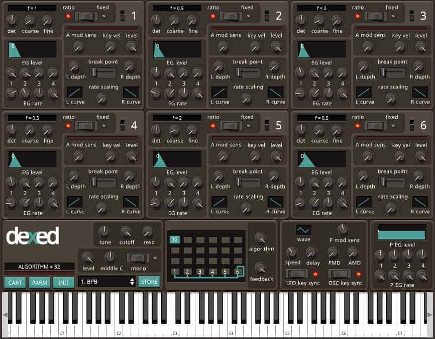 Following a couple of instruments relying on subtractive synthesis, let’s add a pure FM synthesizer to the list. The best free FM synthesizer available right now is Dexed. It is an accurate emulation of the most famous FM keyboard ever, the legendary Yamaha DX7.