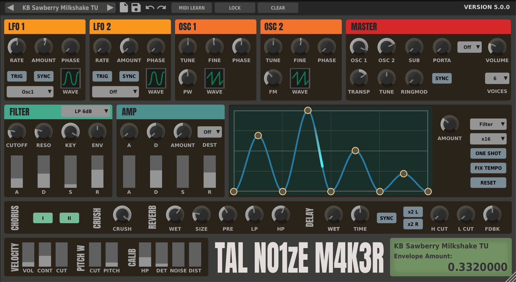 TAL-NoiseMaker is a versatile free synthesizer plugin with dual oscillators, a multi-mode filter, two LFO modules, and a set of built-in effects.