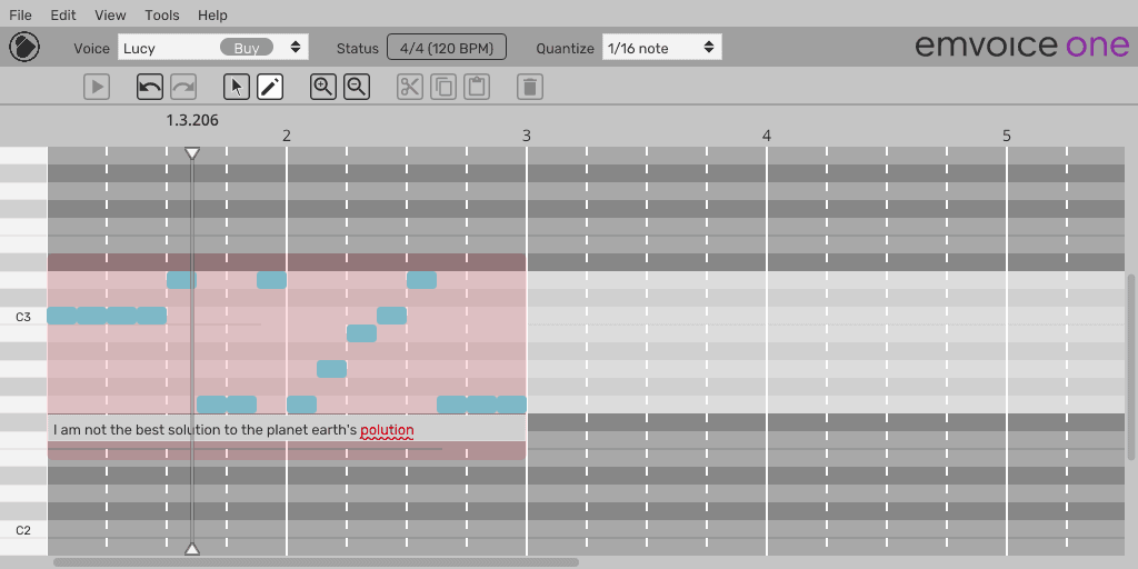 Now let’s talk about the limitations. The free version of Emvoice One features a single female voice called Lucy. Before purchasing the full voice pack for a whopping $200, Lucy can only be used to sing a seven-note range, from H2 to D3. If you draw a note outside this range, the entire sequence will be highlighted in red and Emvoice One won’t play any audio. This is a huge limitation for anyone who intends to use the plugin as a substitute for a real singer. But there’s still plenty of fun to be had with less demanding melodies or simple vocal phrases and spoken words that fit within Lucy’s demo range.