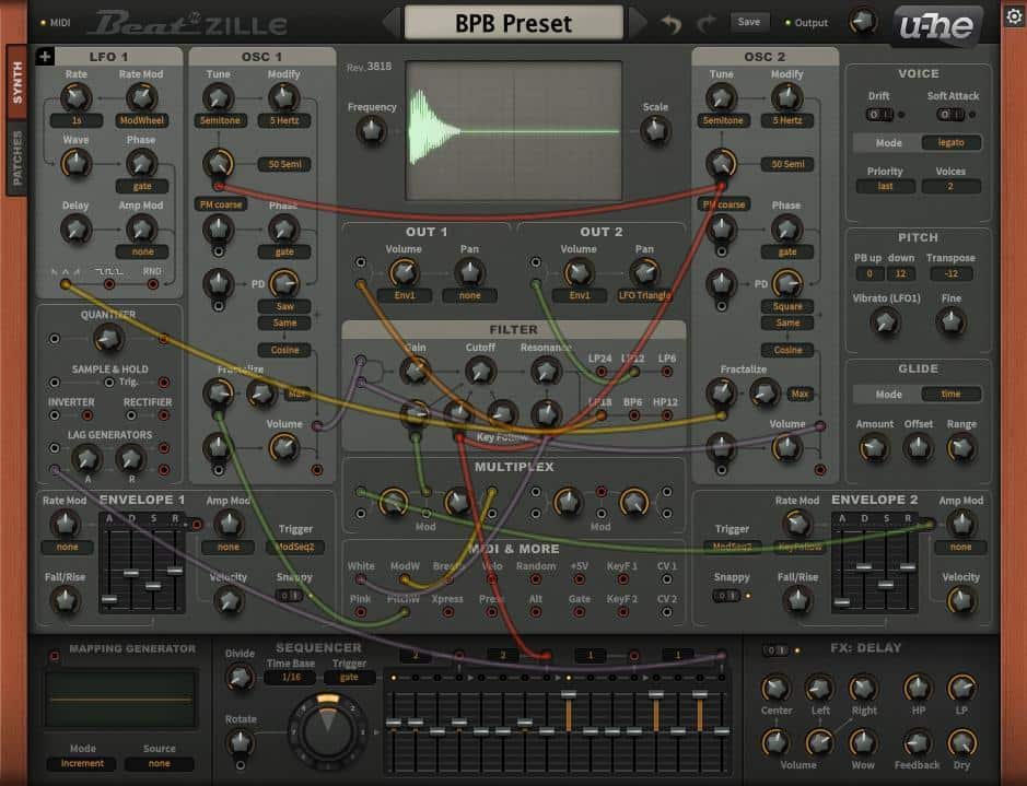 Beatzille is a lighter (in terms of available features), but still totally awesome version of the Bazille synthesizer by U-He. Compared to the full version of the plugin, Beatzille features less oscillators (two instead of four), less filters, LFOs and envelope generators (one of each), less effects (only the delay effect is included), reduced polyphony and the lack of multi-core CPU support. On the other hand, it is still an incredibly versatile virtual instrument with a great sounding filter, excellent oscillators, and all the modular patching fun you could ask for! The synth is compatible all VST/AU/AAX plugin hosts (both 32-bit and 64-bit) on Windows, Mac OS and even Linux!