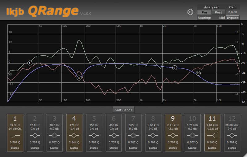 The plugin features a well-designed user interface which can be freely resized. The upper half of the UI features the EQ curve display along with a real-time spectrum analyzer. The twelve frequency band controls are positioned right below the spectrum display. Each band can be used as peak, shelf, or a cut filter, with different routing options available per-band (stereo, left, right, mid, or side). The spectrum analyzer can be set to show pre or post EQ analysis of the signal’s frequency spectrum. The plugin also features a bypass switch for easy A/B comparison.