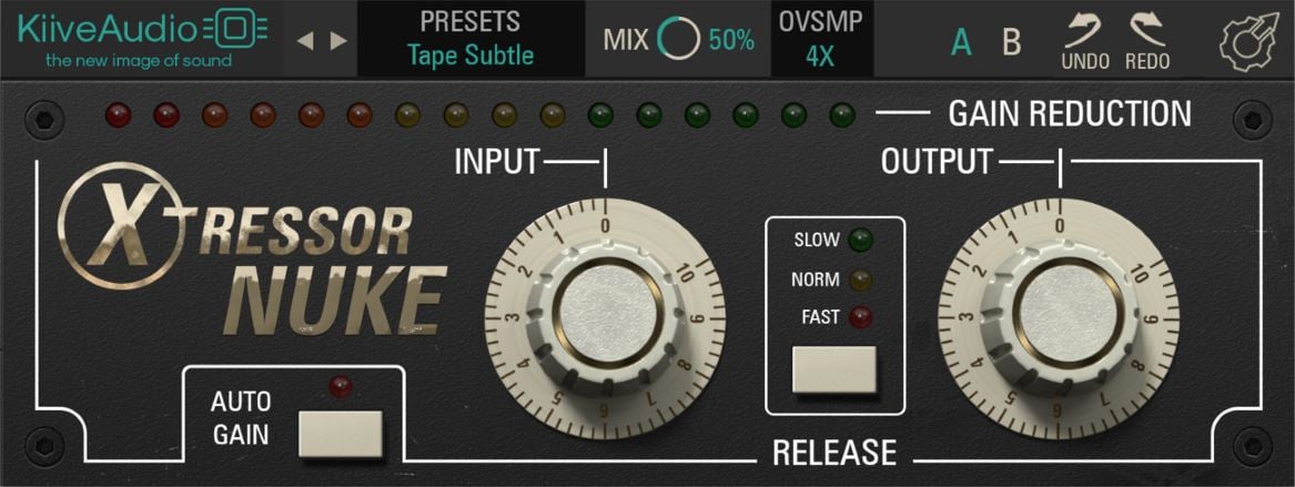 In the case of Xtressor NUKE, the Input knob controls the compression intensity, and the Auto Gain lets you completely forget about gain adjustment as the plugin will handle that automatically. That leaves the Release button, which lets you select one of the three available release time settings (Fast, Normal, and Slow).