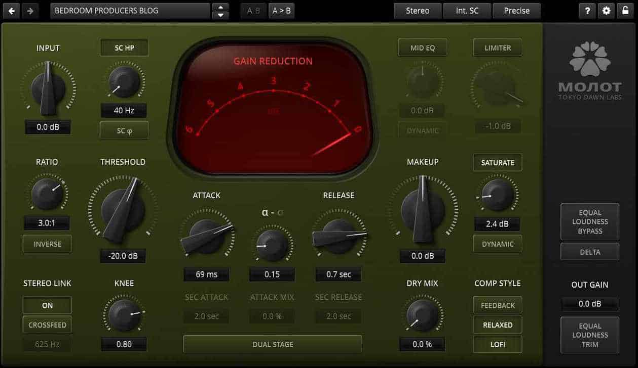 TDR Molot GE takes all the features from TDR Molotok and adds a limiter, saturation control, three compression modes (Feedback, Relaxed, and LoFi), stereo link, crossfeed control, equal loudness bypass, and more.