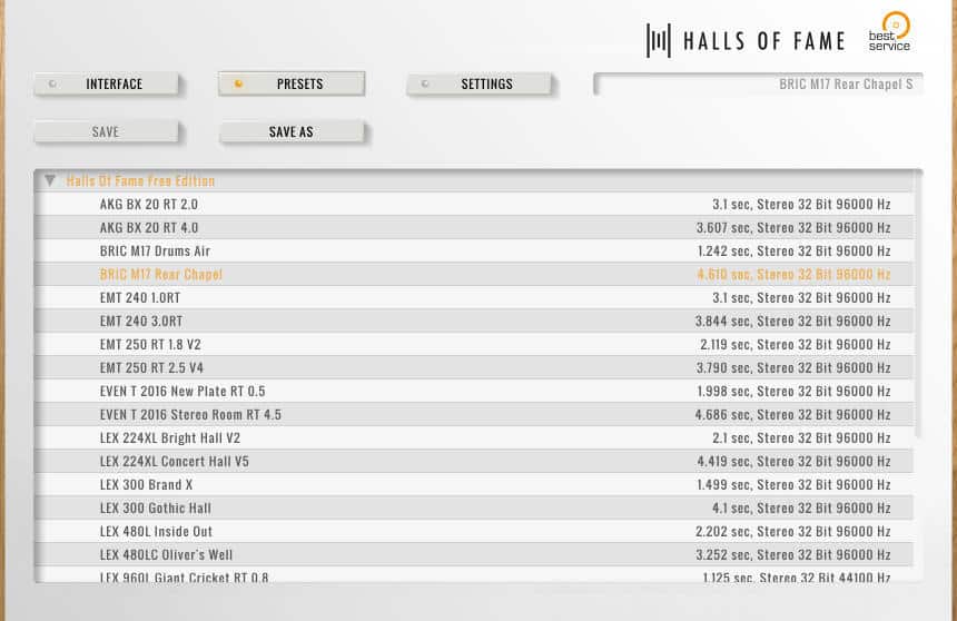 Even though it is very limited compared to the other versions of HoF 3, the free edition still offers great value, especially considering the quality of the included convolution reverb presets. Featuring the sounds of classic hardware reverbs such as the EMT 240, AKG BX 20, Lexicon PCM96, and Bricasti M7, this is a great little reverb unit to add to your arsenal completely free of charge. Take a closer look at the included reverb presets on the screenshot below.