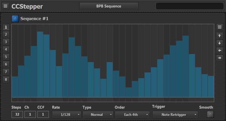 CCStepper is my favorite one of the bunch. It is a MIDI CC data sequencer, suitable for controlling MIDI capable software or external devices. Basically, you pick a CC# and use the provided 64-step sequencer to send host synced MIDI data. You can pick any number of steps between 1 and 64 and the rate goes from 32/1 to 1/128, which is simply brilliant. The sequencer can be synced to host (default setting), but it can also be triggered by incoming MIDI notes. The Smooth function smooths out the steps in the current sequence, resulting in a more natural LFO-like performance. There are several other neat features hidden under the hood, like step randomization, preset sequences, different playback modes, etc. If you’re looking for a MIDI CC# generator for your DAW, this plugin is a great candidate.