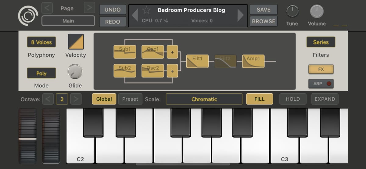 The iOS version is almost identical to the desktop version in terms of features and functions. The two main differences are that the app offers sixteen voice polyphony and 650 presets, while the desktop version provides 32 voice polyphony and 1250 presets.