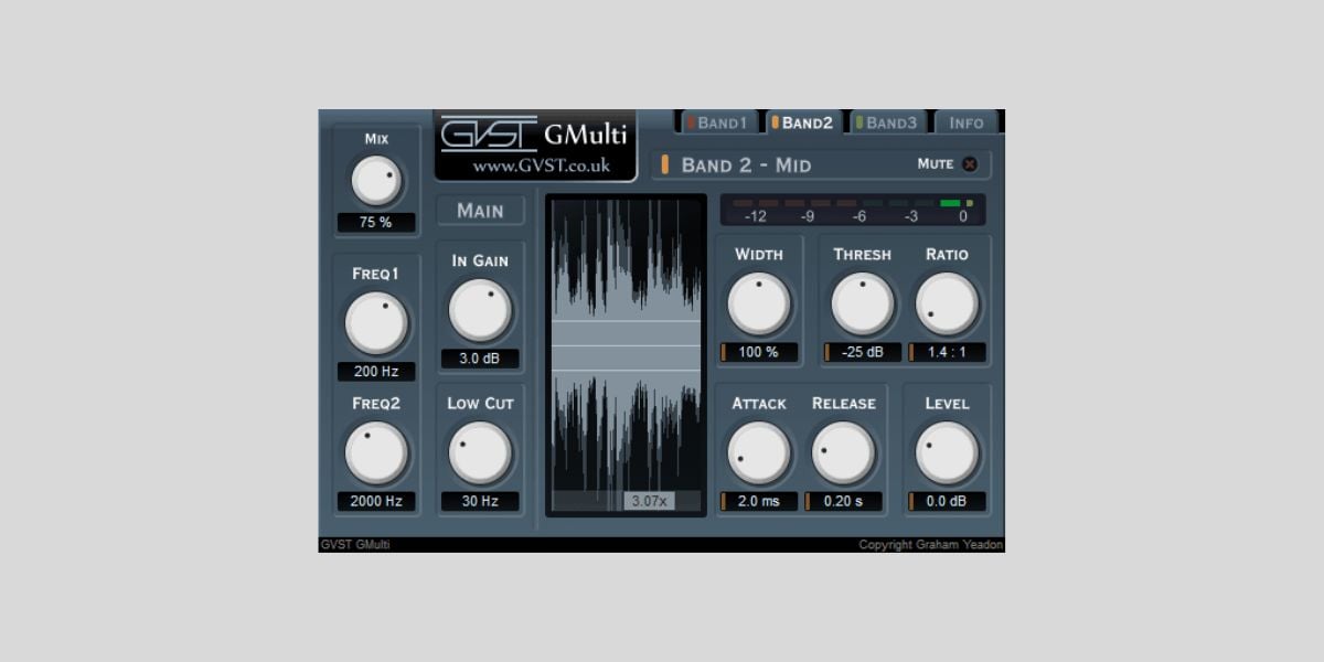 The plugin offers three compression bands with compression, stereo width, and level controls for each band. GMulti also features a real-time waveform display that shows the difference between the dry and compressed signals.