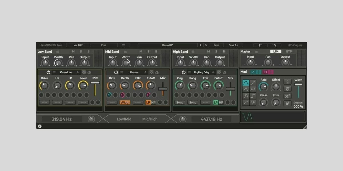However, nothing prevents you from using HY-MBMFX2 Free as a regular multiband compressor. Load the compressor module in each FX slot, and you’ll get a powerful 3-band compressor with unique modulation options.