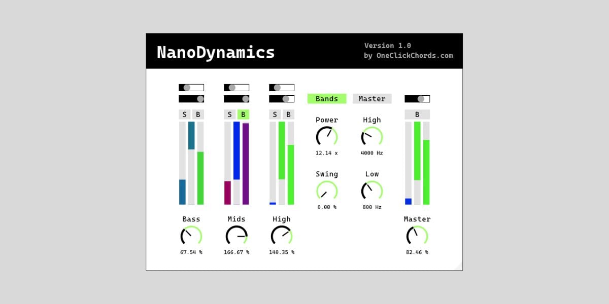 Nano Dynamics is a free multiband compressor plugin developed by OneCluckChords. While sporting a deceivingly simple GUI design, the plugin packs some advanced functionality under the hood.