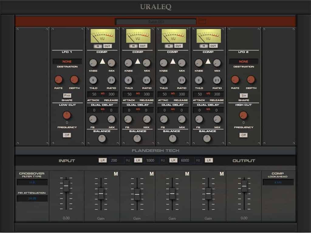 Uraleq is a multiband compressor plugin for Windows. It has advanced features like mid-side processing, two crossover filter modes (Linkwitz-Riley and linear-phase), amplitude modulation, and other valuable tools you probably won’t find in other multiband compressors.