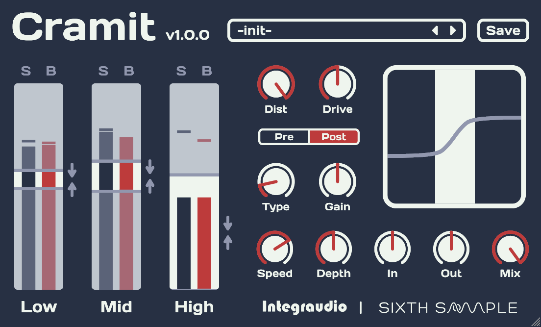 Cramit is another “over-the-top” free multiband compressor. It offers the same basic functionality as OTT by Xfer Records, with the added bonus of applying saturation to the signal.