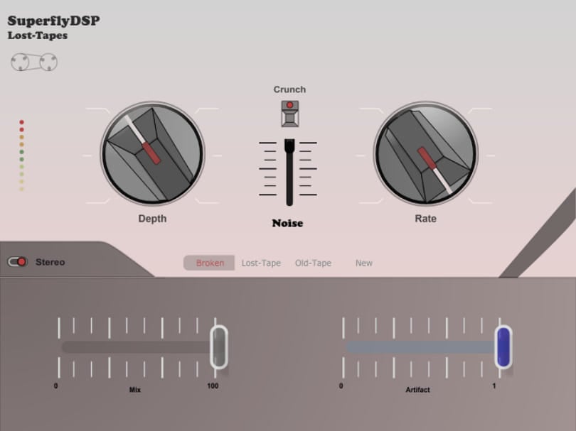 The Depth knob sets the amount of the tape effect, and the Rate knob increases the flutter frequency. These two controls provide a wide range of tape effects, from the most subtle vintage feel to a completely wonky sound. Engaging the Crunch button will add more harmonic distortion, and the Noise slider increases the noise volume.