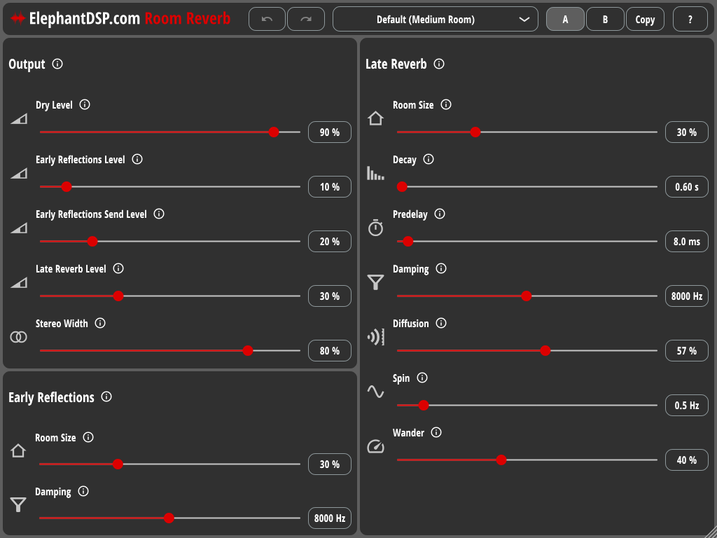 The developer has included a bunch of presets from small rooms to very large rooms. My personal preference is the small to medium room presets, just enough to round off any harshness. I particularly like the Small Room (Dark), and Medium Room (Dark) presets.
