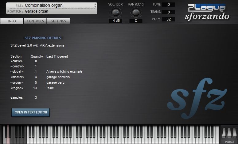 The instrument was designed for working with SFZ files, however it also loads SF2 (aka SoundFont format), as well as DLS and WAV files (which instantly get converted to SFZ format). Although you can use sforzando as just a regular sampler for playing WAV files, you’ll definitely need some knowledge about the SFZ script in order to get the best out of it. The best way to get started would probably be to load a few SFZ libraries in it and take a look at the included script and how it affects the playback of the samples.