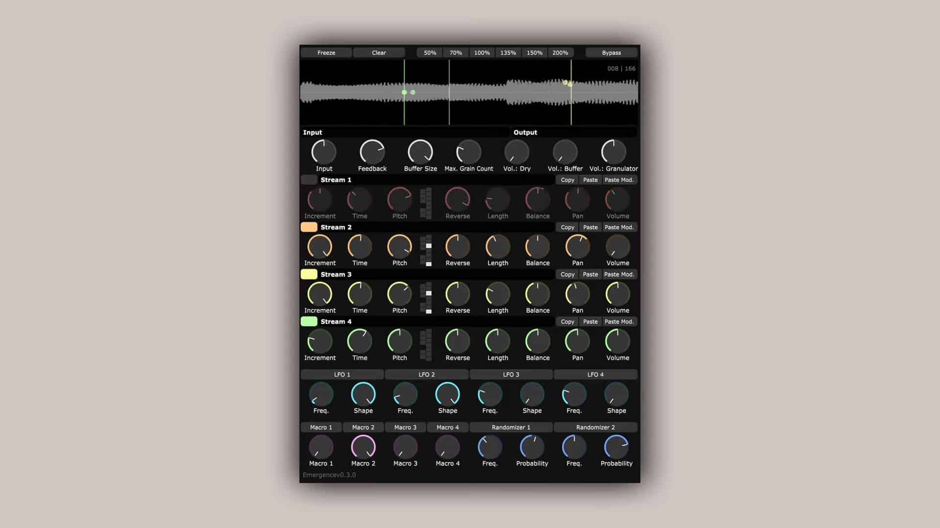 Emergence continuously looks at the input signal in its buffer and then lets you playback your audio as a set of grains.