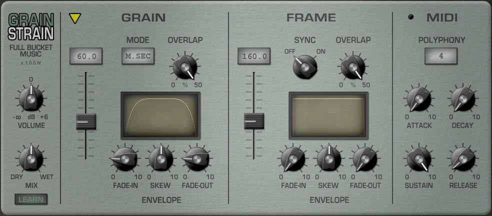 The Grain section lets you loop the grains, while Frame controls how the plugin switches to a new loop. Grain Strain can work in “free time” mode or sync to your host tempo.