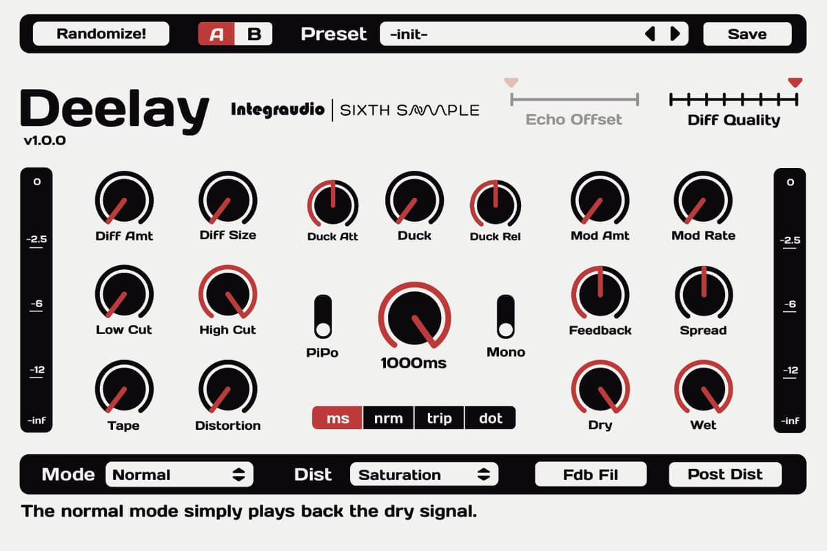 Deelay is a result of a collaboration between Sixth Sample and Integraudio. It is a versatile delay effect with several processing modes.
