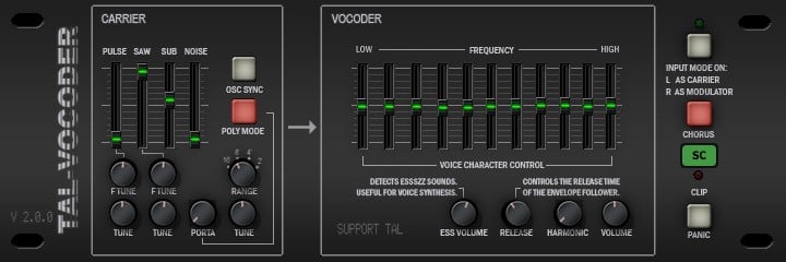 TAL-Vocoder emulates the vintage hardware vocoders from the early ’80s. It features an 11-band vocoder engine that combines analog modeled components and digital algorithms like the SFFT (Short-Time Fast Fourier Transform). The carrier signal can be either internal or external. The internal carrier features pulse, sawtooth, sub, and noise oscillators with oscillator sync, tuning, octave range, and portamento speed controls. It can operate in monophonic and polyphonic modes.